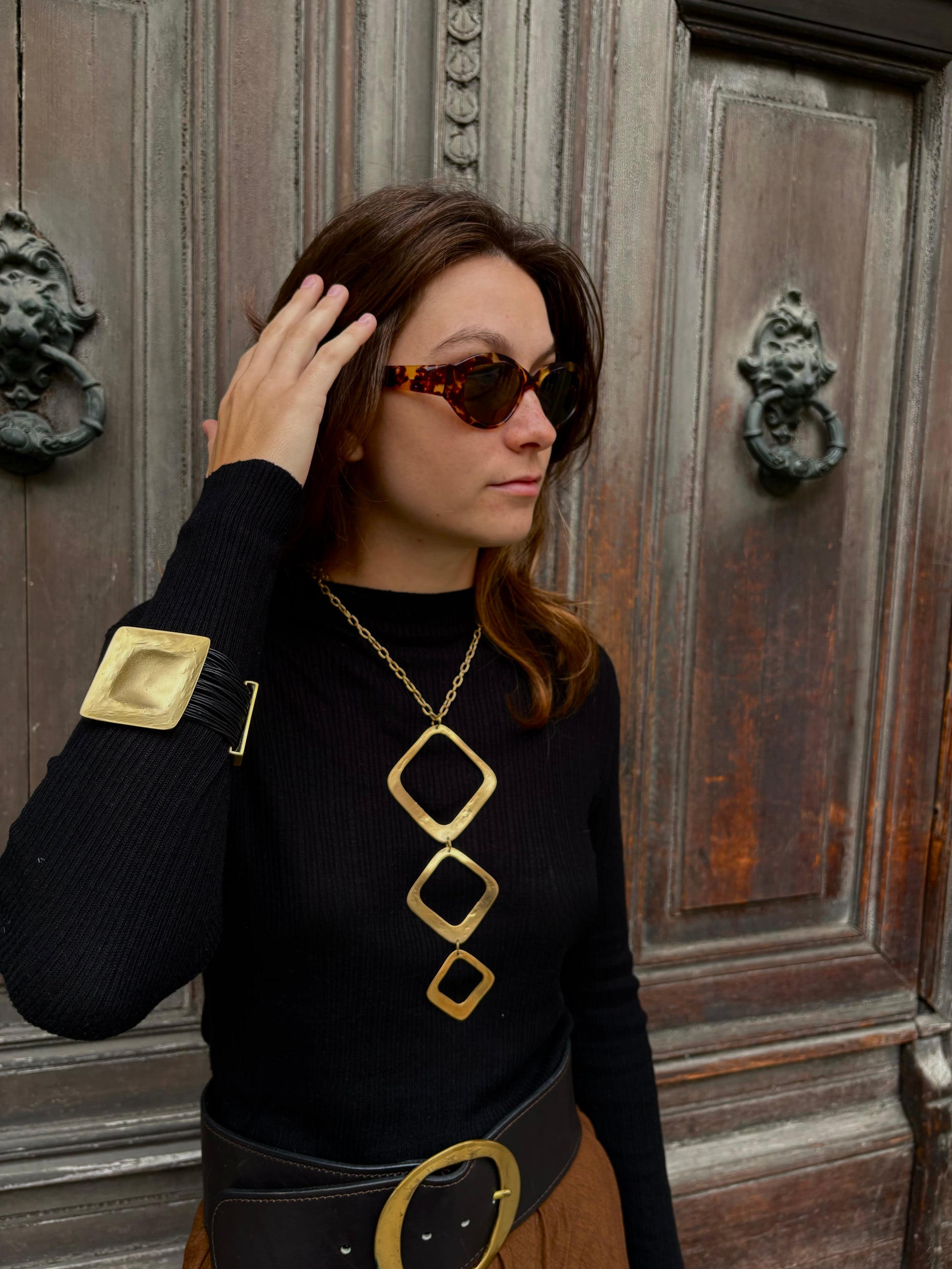 Bracciale VULCANO unisce design moderno e un’eleganza sofisticata. È caratterizzato da una fascia centrale composta da fili neri multipli, che creano un effetto visivo dinamico e avvolgente. Al centro, spicca una placca quadrata in metallo dorato, dalla finitura leggermente martellata, che aggiunge un tocco di carattere artigianale. Le estremità dorate e squadrate si collegano a una catena regolabile con chiusura a moschettone, rendendo il bracciale comodo e adattabile a diverse misure di polso. È un pezzo audace ma versatile, perfetto per arricchire un outfit da giorno o per dare un tocco distintivo a un look serale.