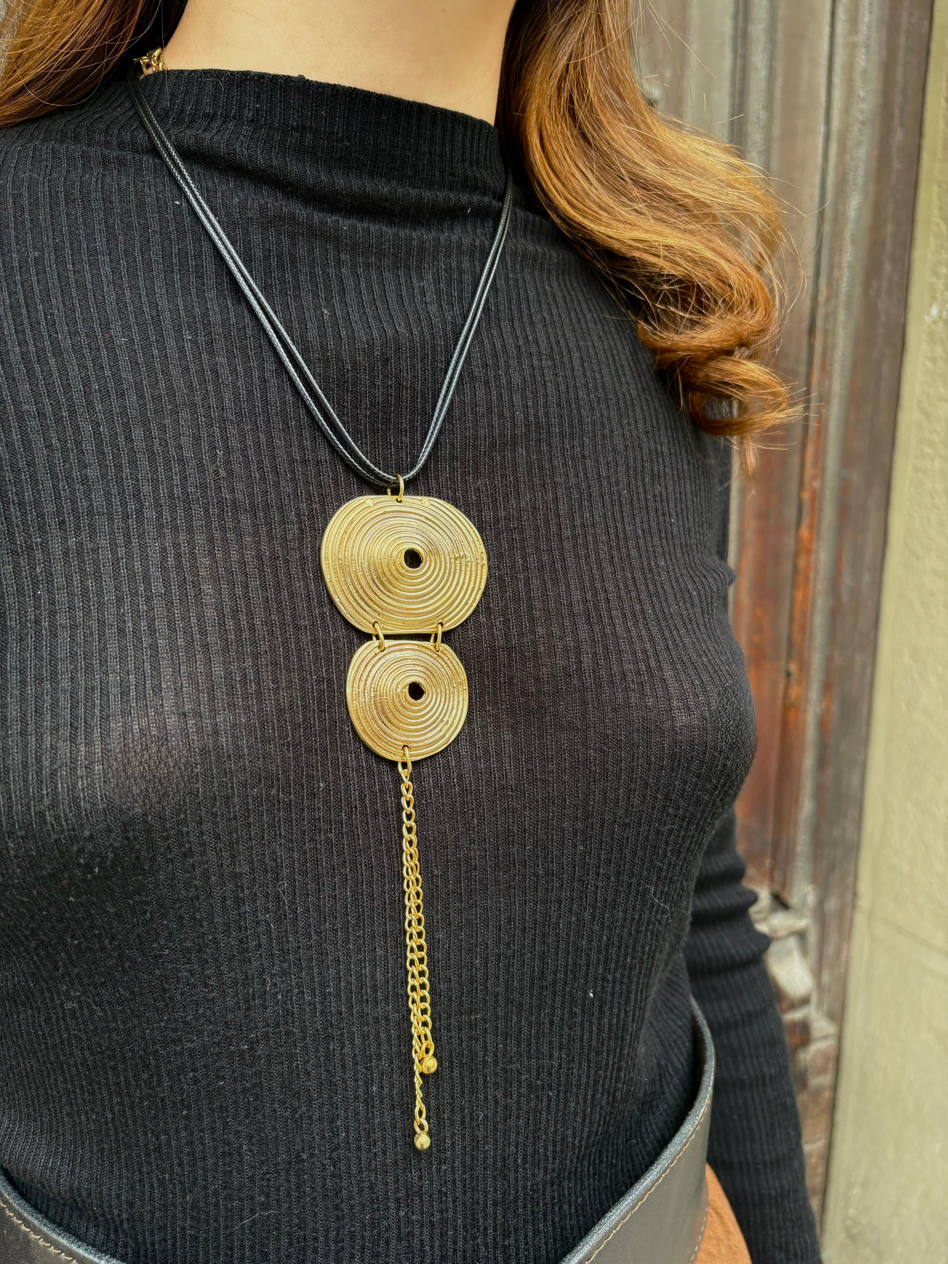 Questa elegante collana SPAZIO VUOTO unisce il minimalismo moderno a un design geometrico e accattivante. I due pendenti circolari, realizzati con fili metallici dorati che formano intricanti spirali concentriche, creando un aspetto visivo raffinato. La collana è montata su un doppio cordino nero, che fa risaltare splendidamente la luminosità dell’oro e offre un contrasto sofisticato. Perfetta per valorizzare un look da sera o per dare un tocco di classe a un outfit casual. La lunghezza regolabile assicura una versatilità perfetta.