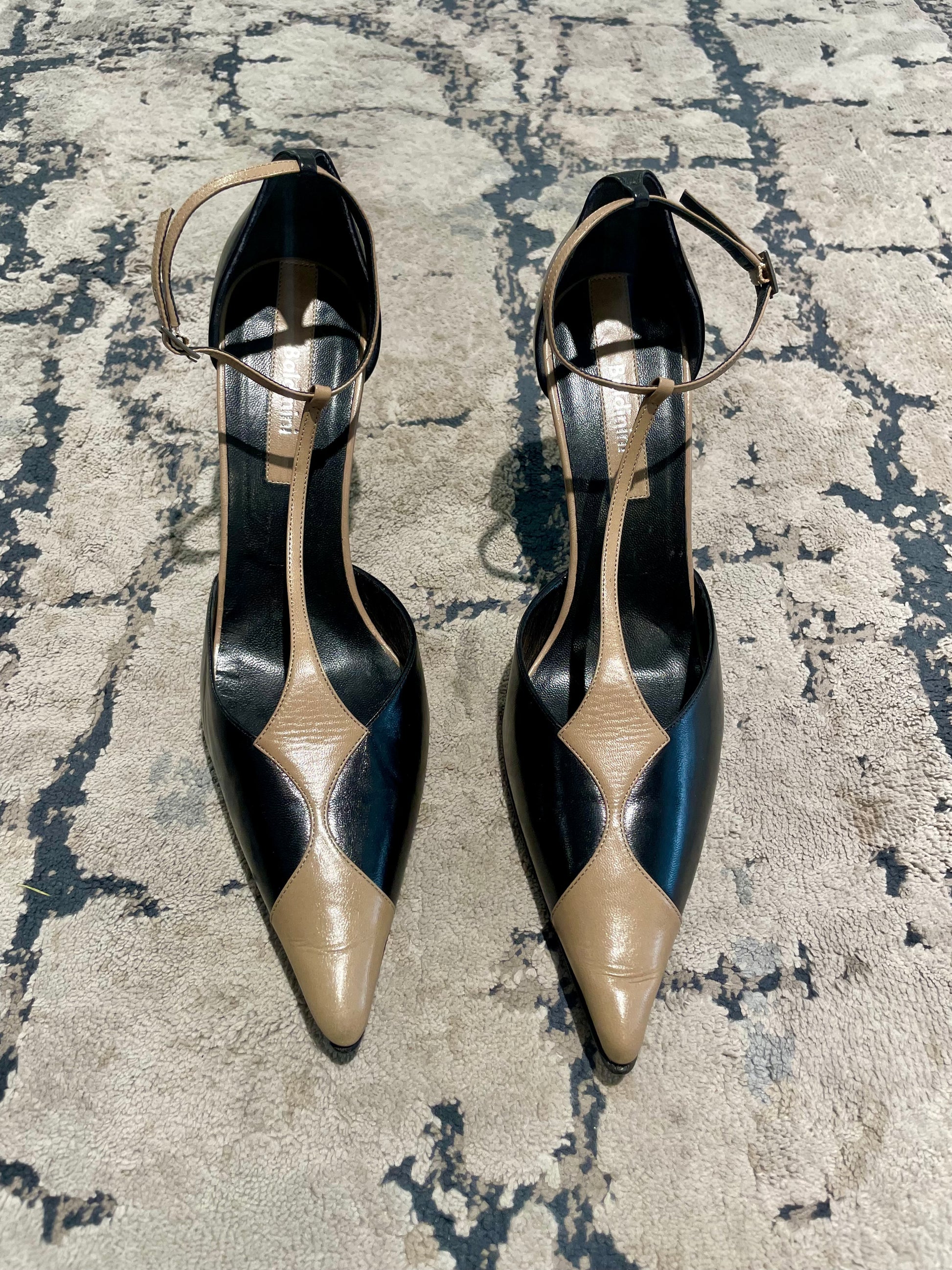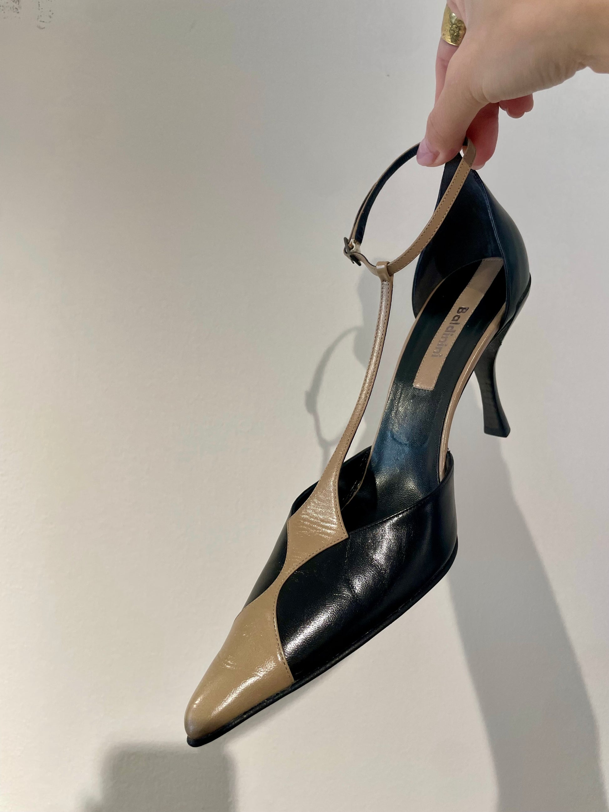 Décolleté elegante realizzato in morbida nappa bicolore. Presenta una combinazione di nero e beige. Il tacco sottile e una fibbia alla caviglia, che aggiungono un tocco di stabilità ed eleganza. Il taglio è asimmetrico, con una linea a V sulla parte superiore che allunga la silhouette del piede.