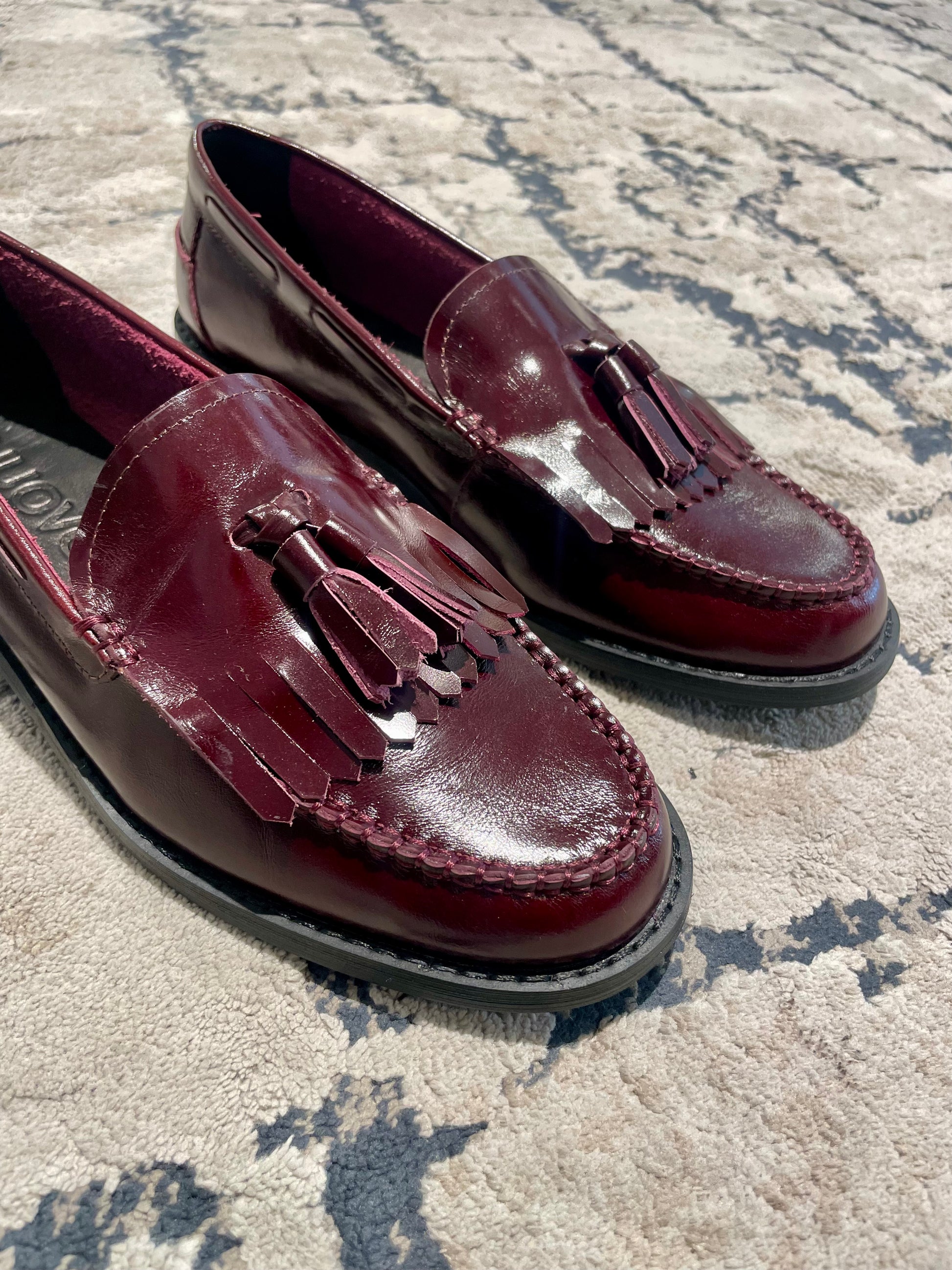 Mocassino con nappe realizzato in pelle lucida color bordeaux scuro. La tomaia è in pelle lucida mentre l’interno della scarpa è foderato da camoscio in una tonalità più chiara. La suola antiscivolo perfette una calzata sicura.