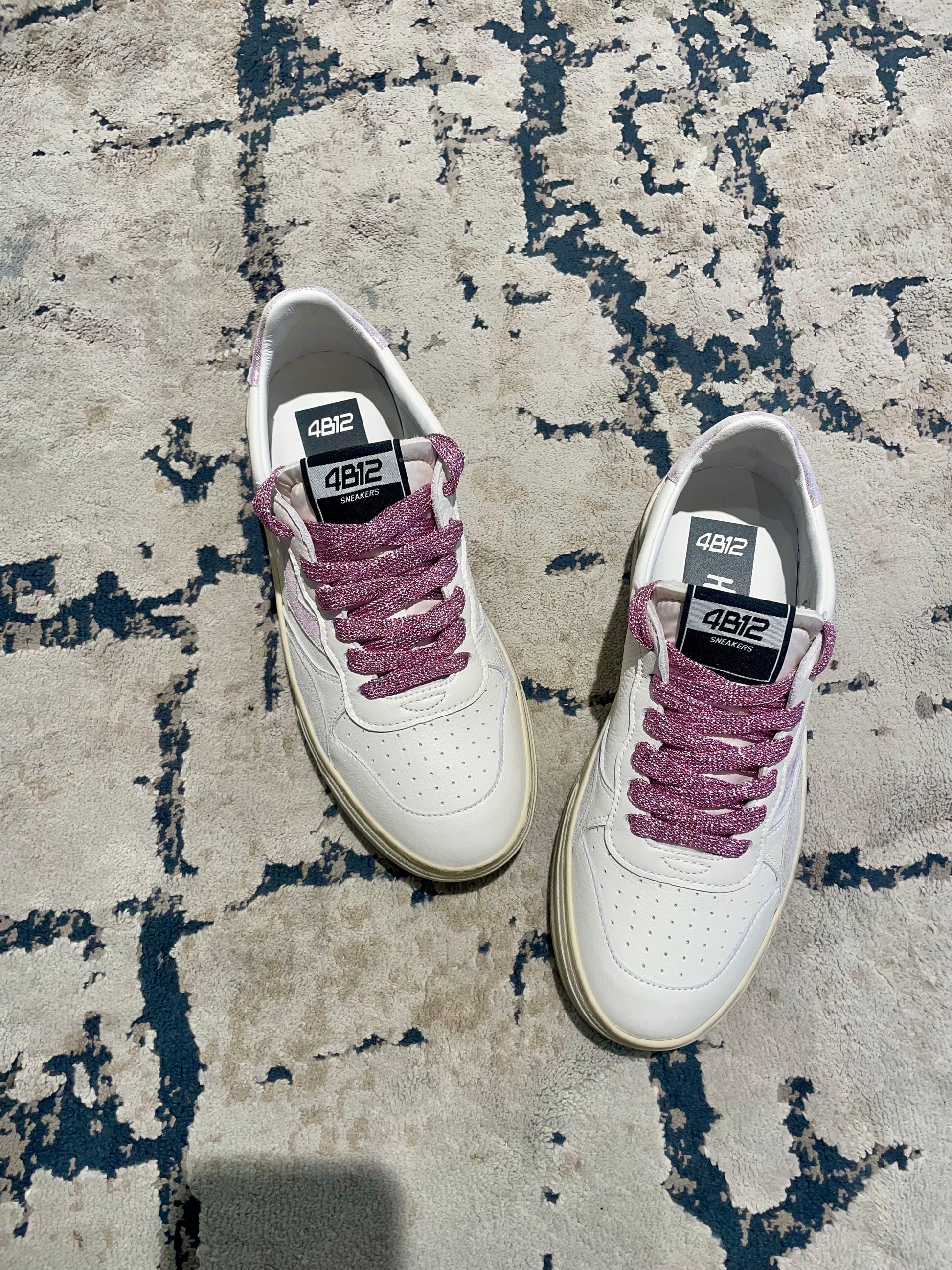 Sneakers 4B12 in pelle bianca con dettagli lilla. Il modello HYPER combina stile e versatilità grazie ad un design moderno in pelle bianca, morbida e resistente. Ideale per completare sia look casual che più ricercati, queste sneakers offrono confort e supporto grazie alla suola in gomma flessibile e antiscivolo. Un modello perfetto per chi cerca un mix di stile urbano e funzionalità, da indossare in ogni occasione.