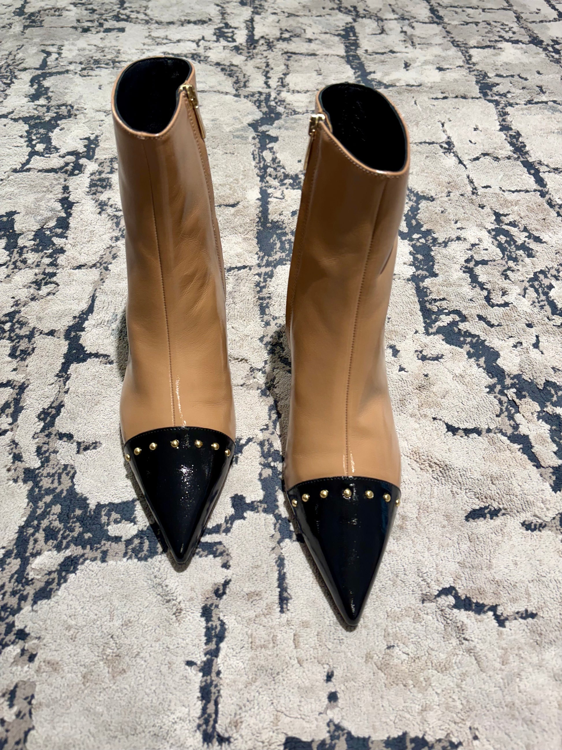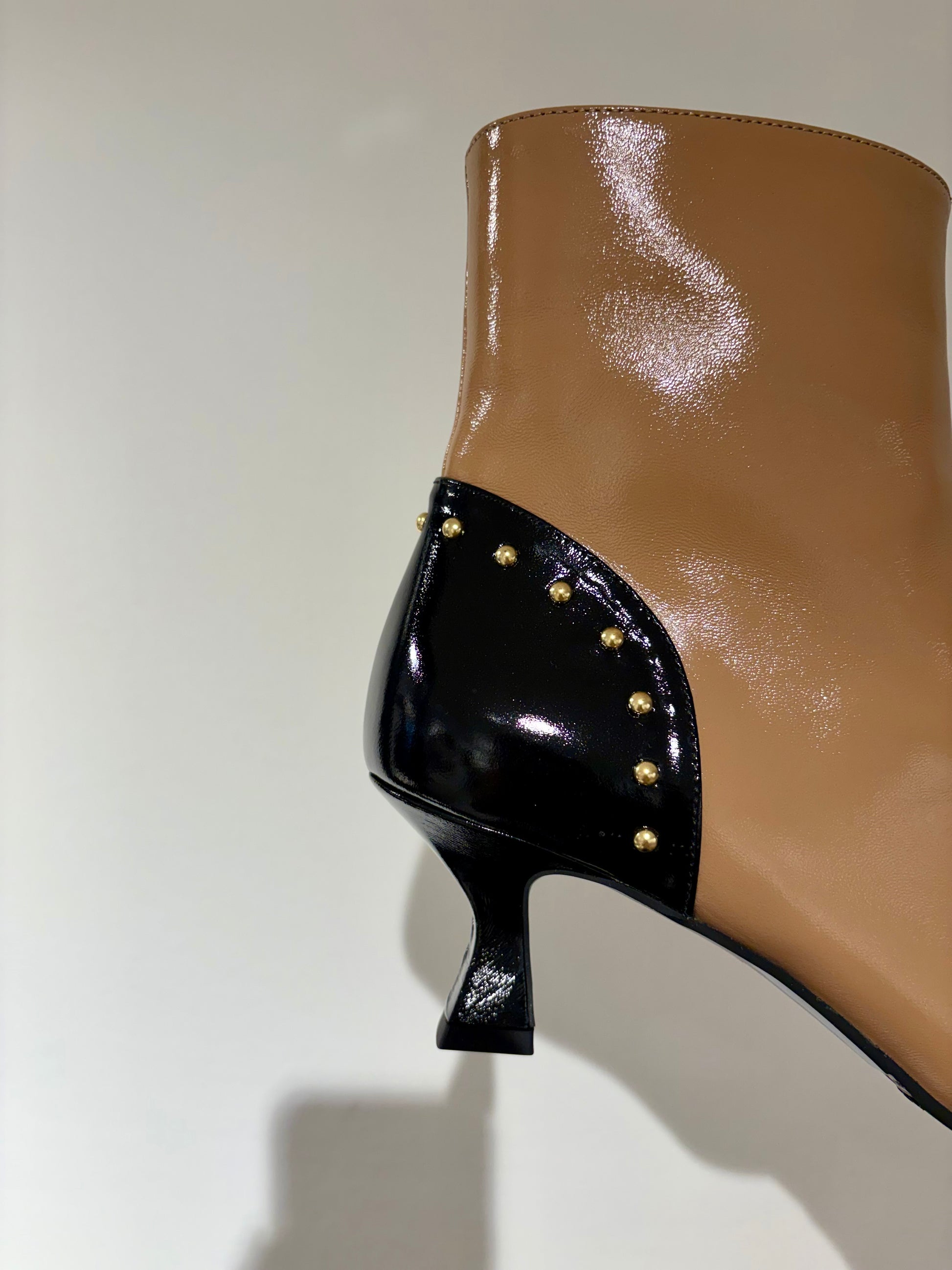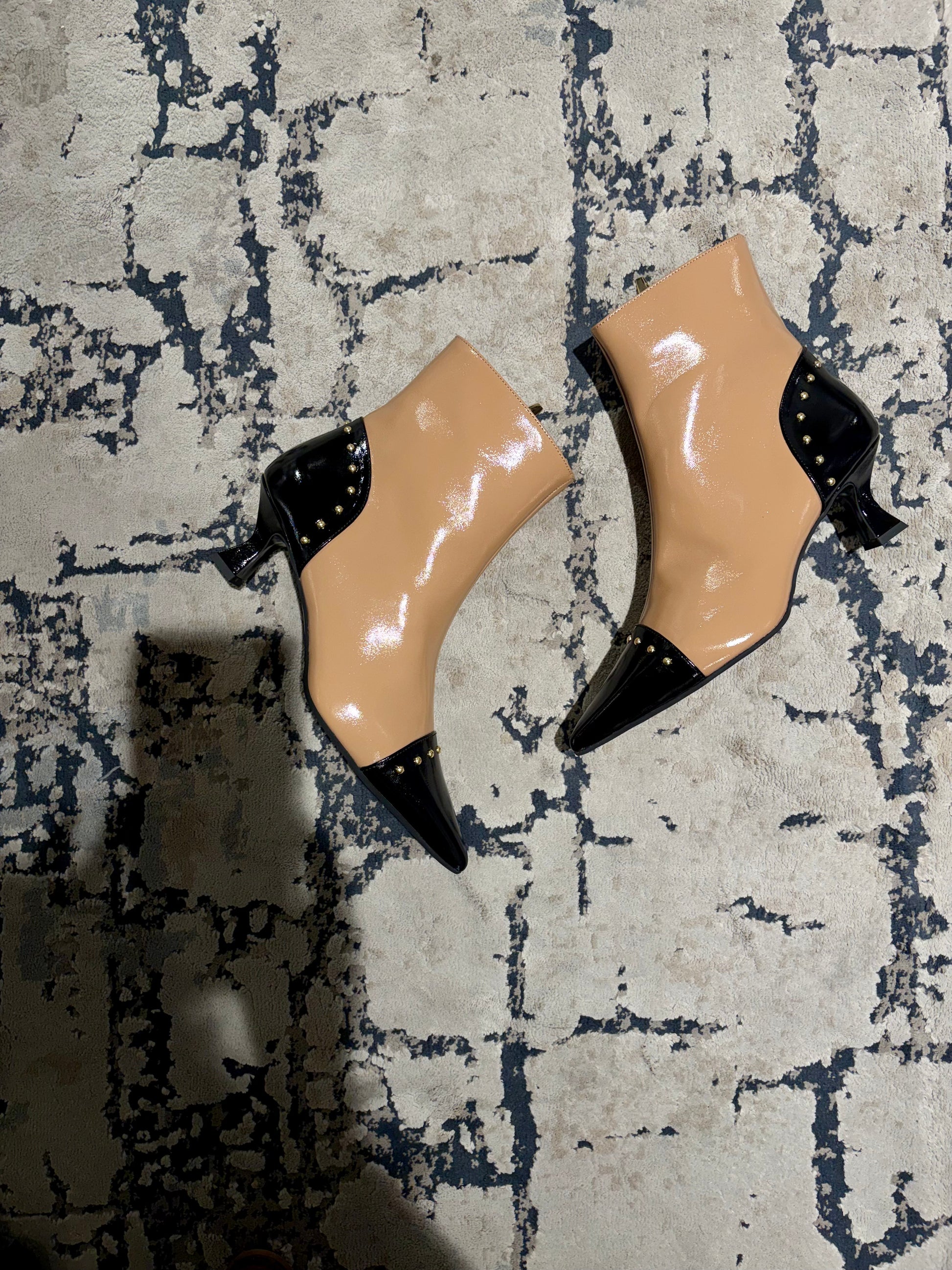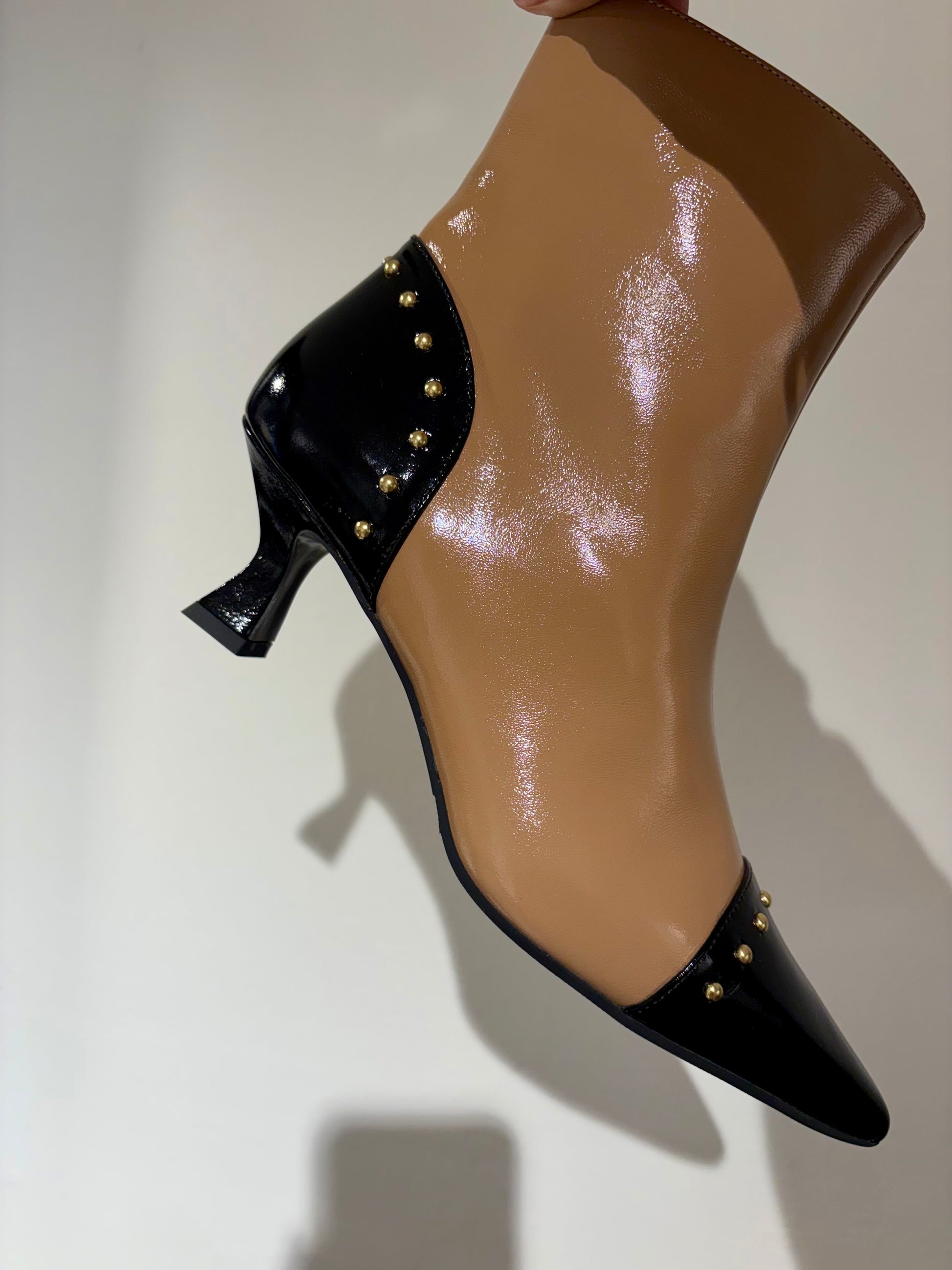 Aggiungi un tocco di eleganza audace e moderna con questi splendidi stivaletti nei toni del nude e nero. Il constrasto tra il nude lucido e la punta crea un look classico. Le applicazioni di borchie sui lati e sul retro dello stivaletto aggiungono moderno. Il tacco a rocchetto con un design distintivo.