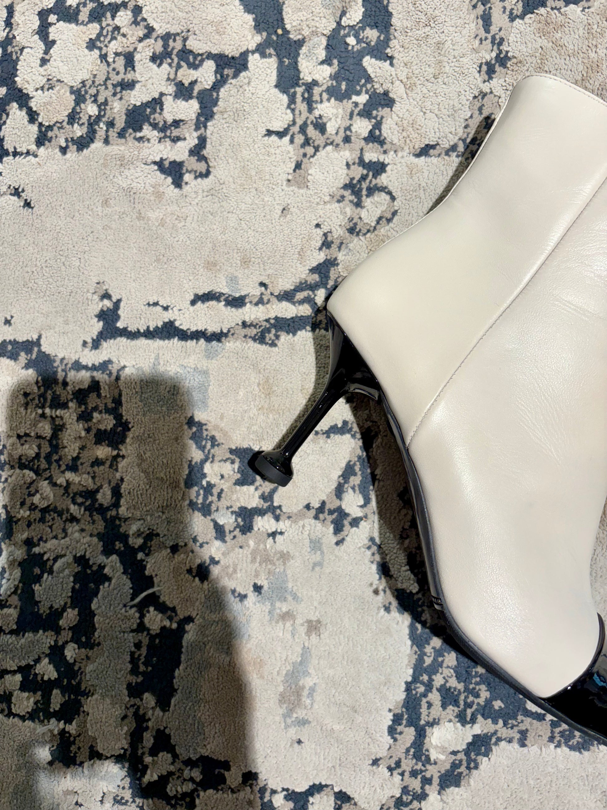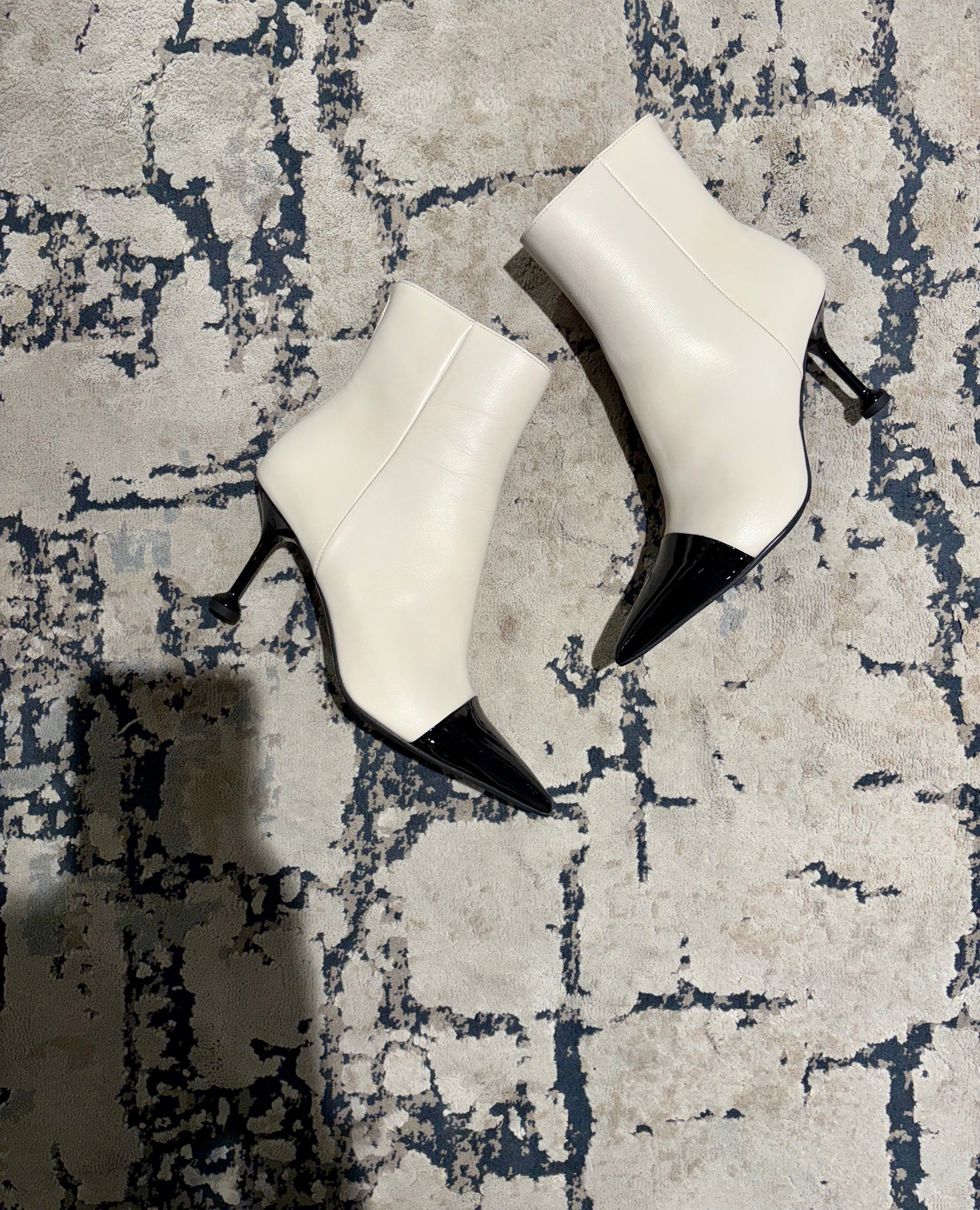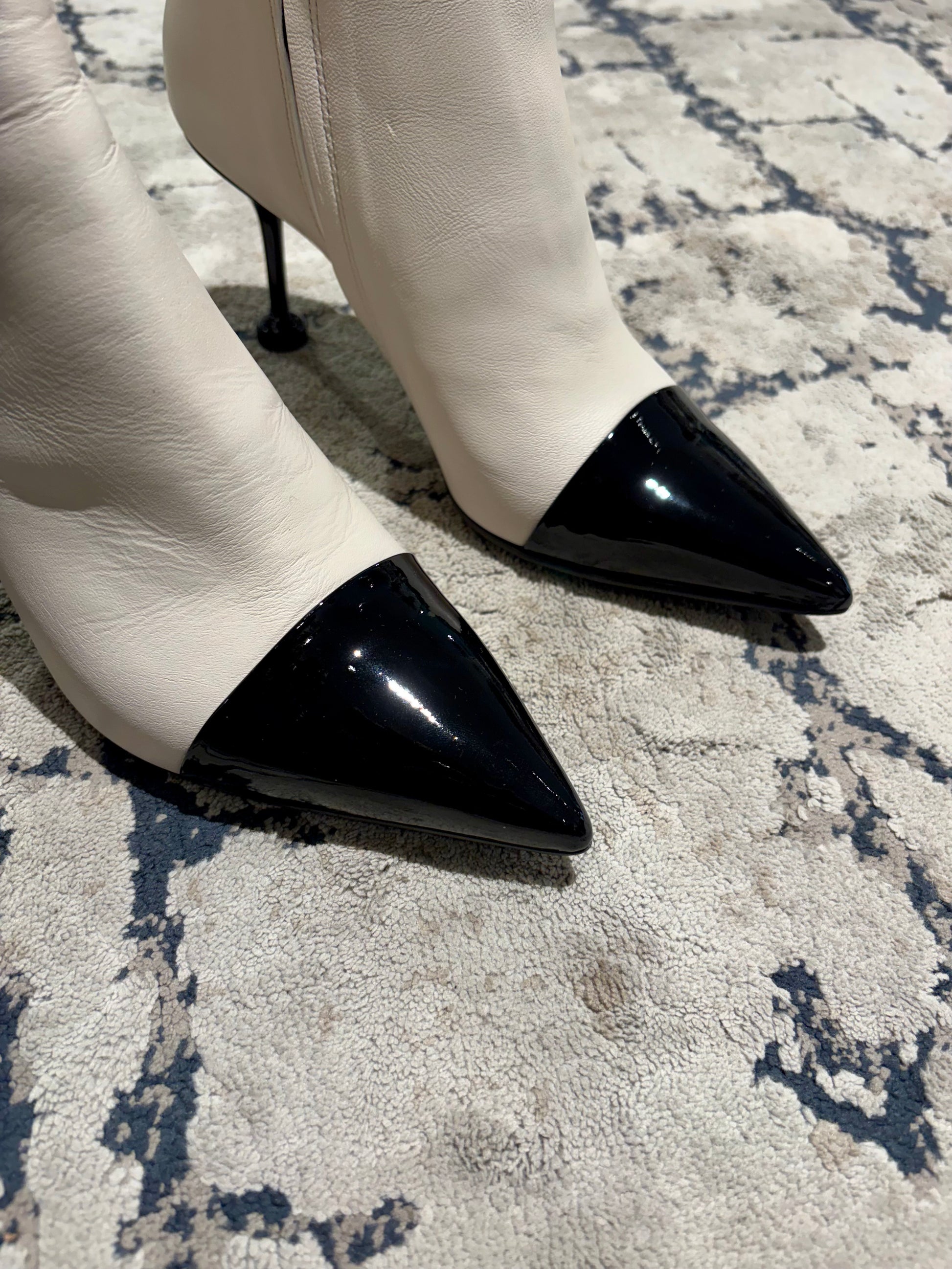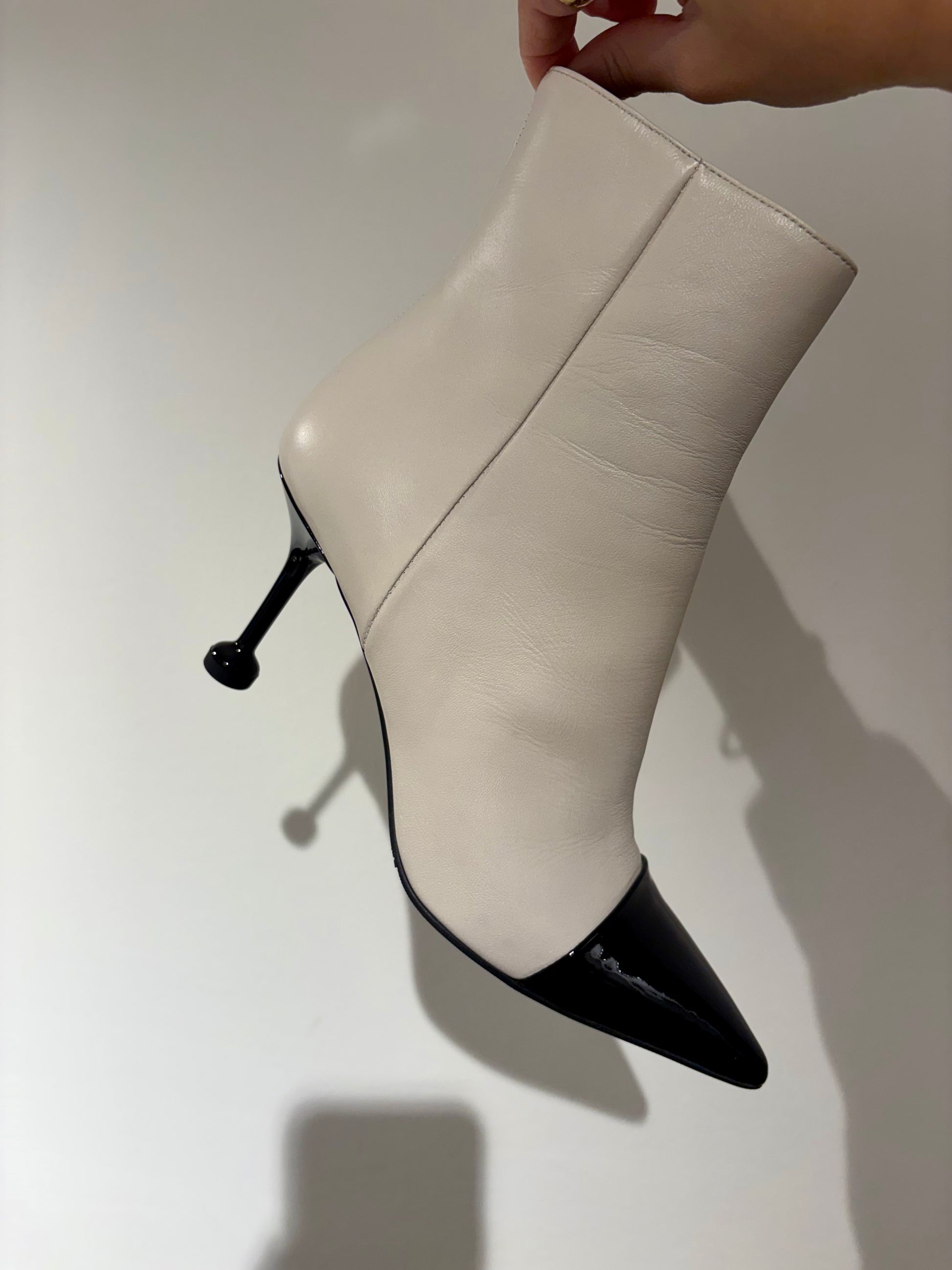 Questi stivaletti uniscono l’eleganza classica del design bicolore e una silhouette audace e moderna. Il contrasto cromatico tra la tomaia chiara e la punta lucida li rende un accessorio di lusso discreto. La tomaia è realizzata in morbida nappa color crema , offrendo una base luminosa. La punta affusolata e decisa allunga la figura e conferisce un’eleganza tagliente. Il tacco a clessidra è alto e sottile, garantendo slancio ed elevando la postura.