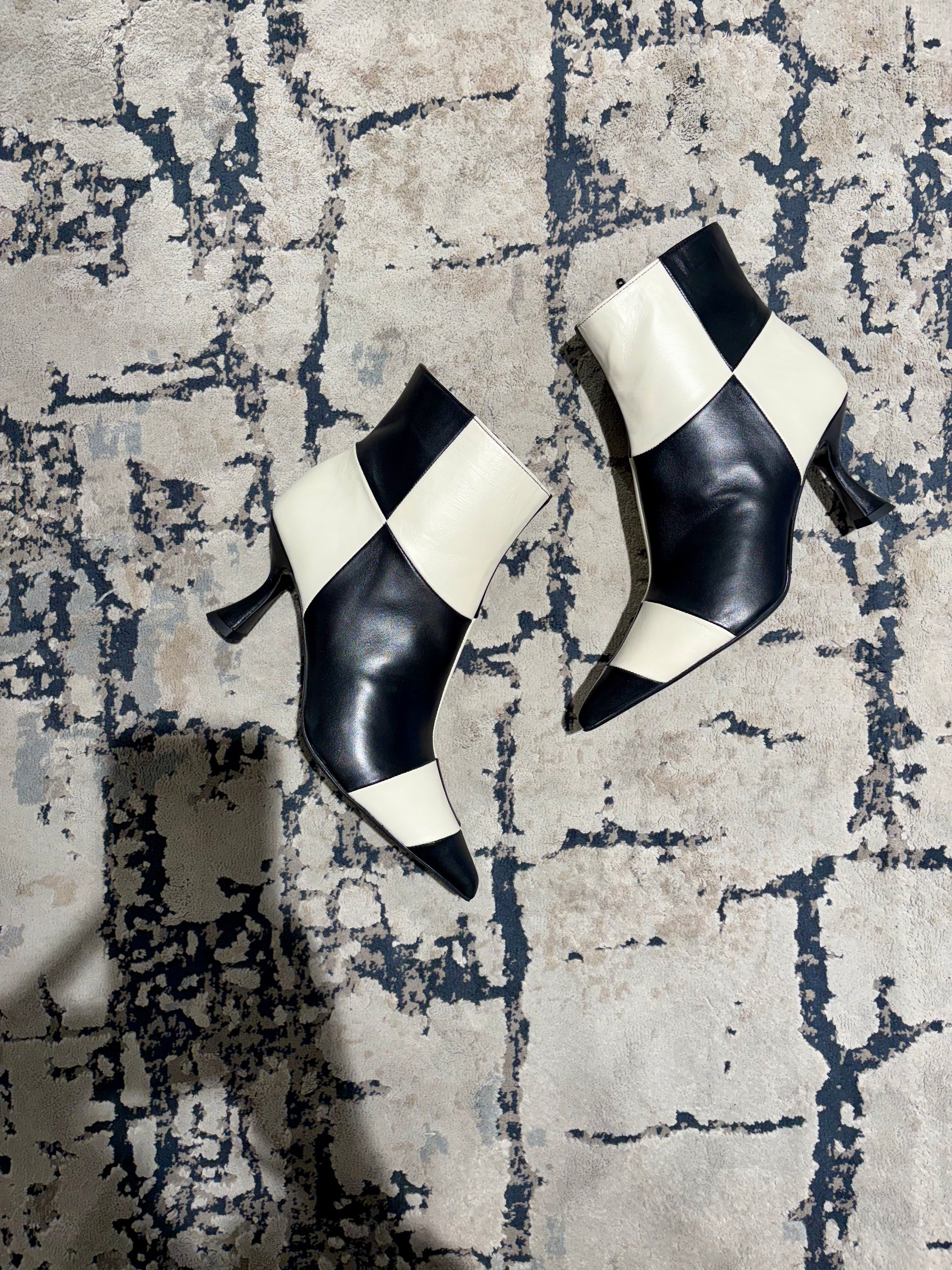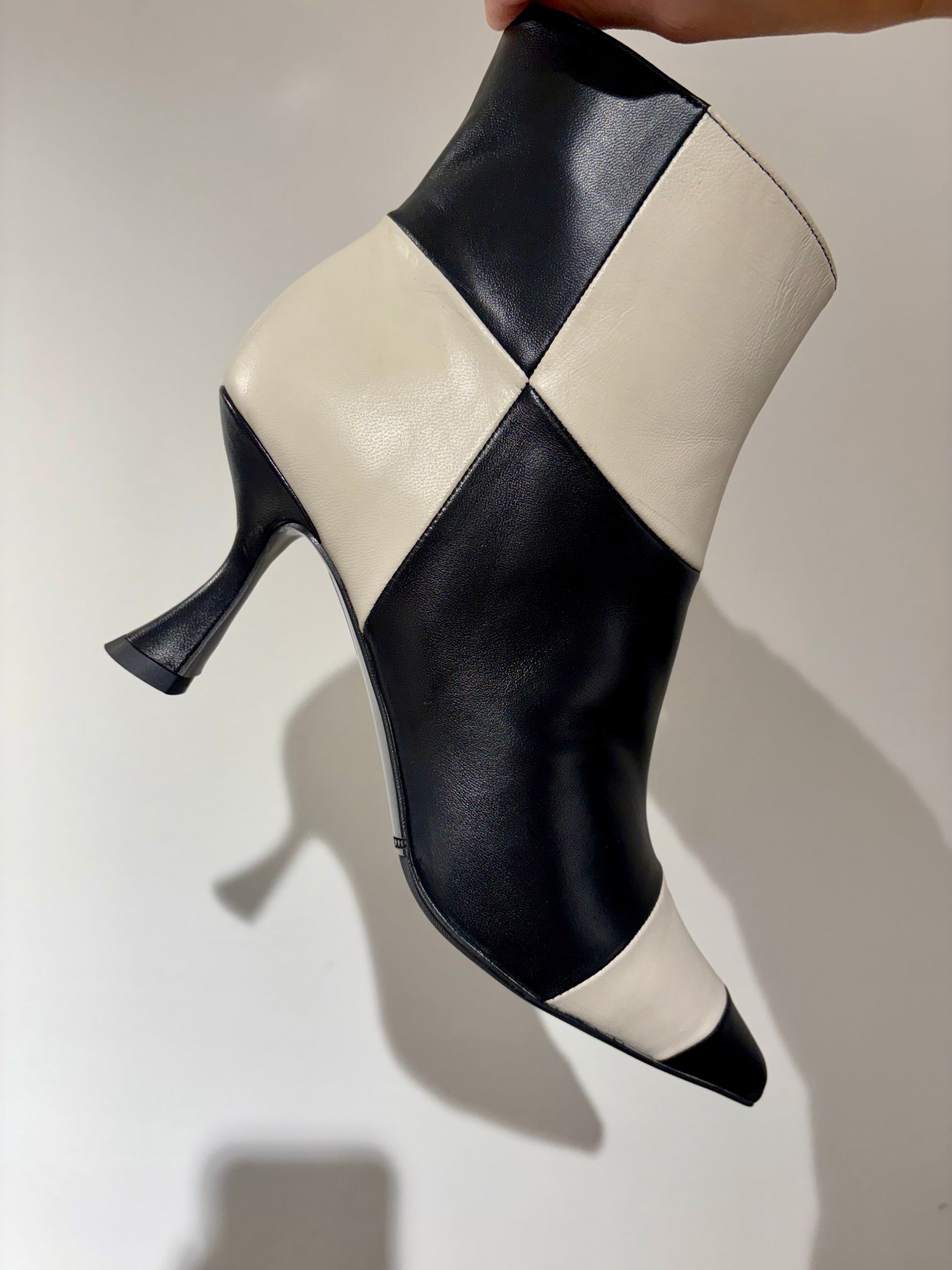 Fai una dichiarazione di stile con questi stivaletti a quadri bianchi e neri. Unendo il design classico dello stivaletto alla caviglia con un motivo geometrico di forte impatto, sono l’accessorio perfetto per infondere personalità. La caratteristica principale è sorprendentemente il motivo a quadri in morbida nappa bianca e nera che avvolge la tomaia. La silhouette è completata da una punta affusolata e decisa che slancia la figura e conferisce un’eleganza tagliente. Il tacco di altezza media ha una forma a rocchetto che combina stabilità e una linea sofisticata.