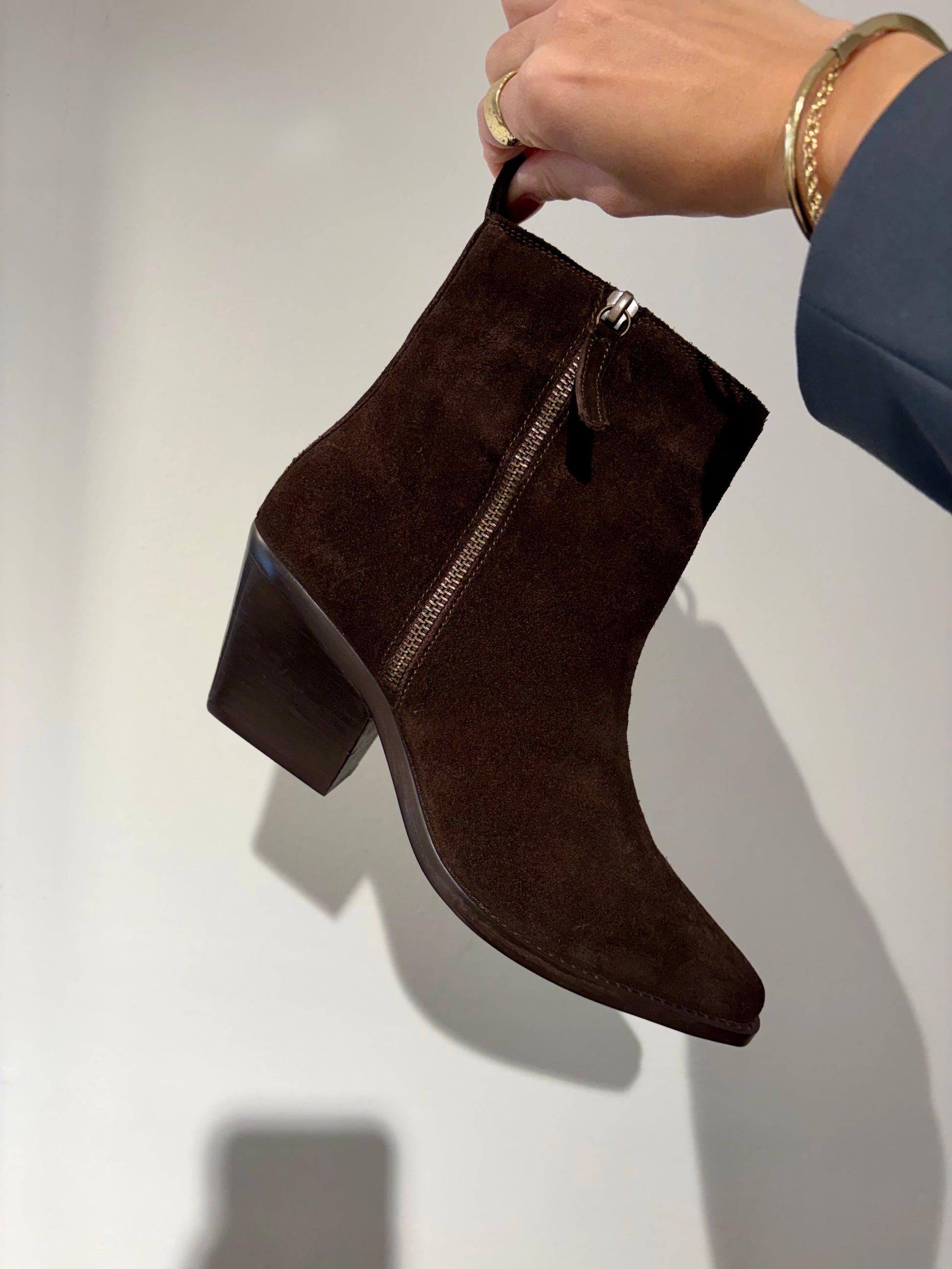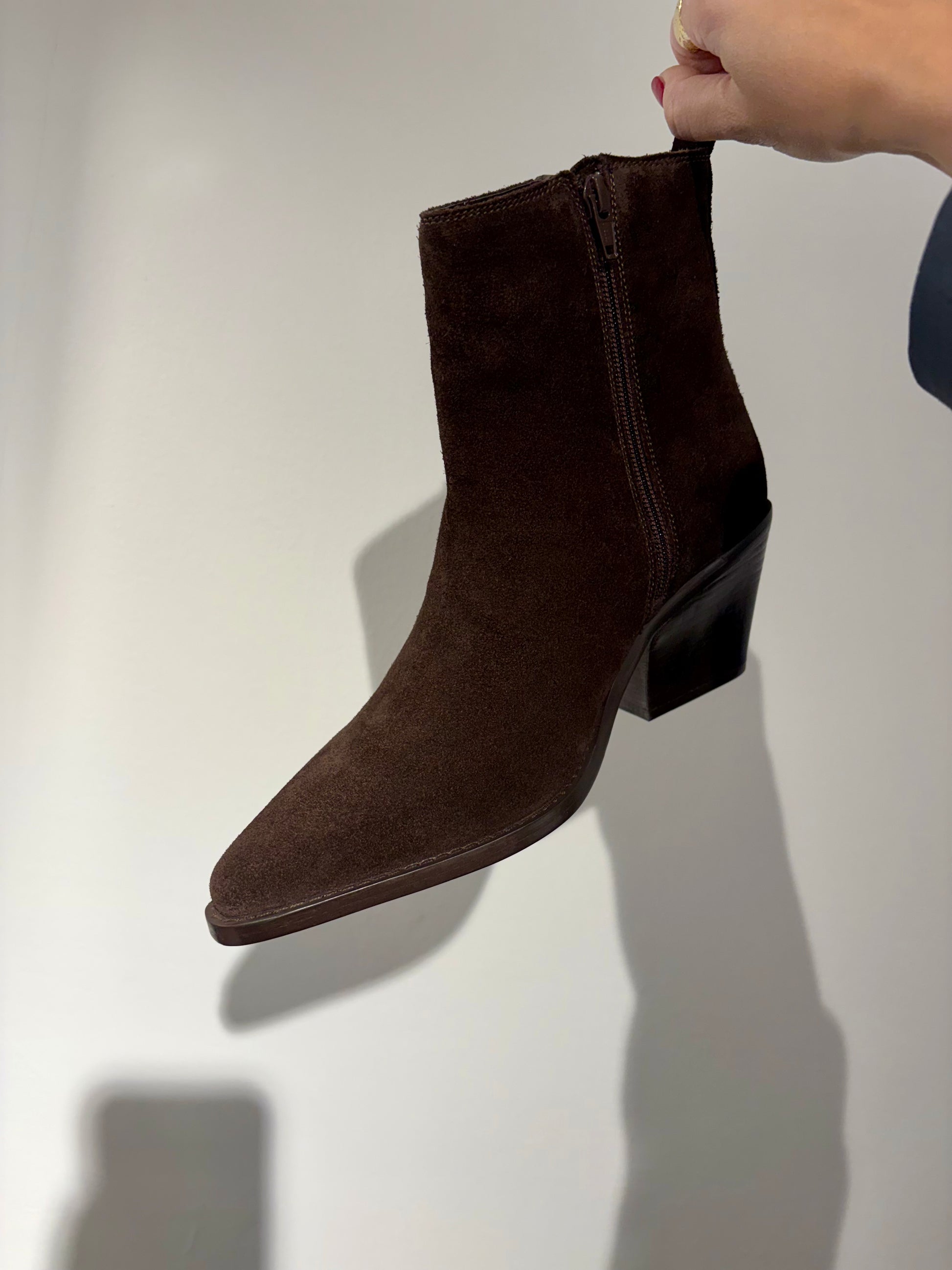 Stivaletto alla caviglia dal fascino contemporaneo, che combinano l’eleganza del camoscio con un’ispirazione western chic. Il colore versatile li rende un must-have per l’inverno. Realizzati in camoscio color testa di moro. Modello alla caviglia con una linea pulita e minimalista.punta affusolata e leggermente squadrata. Tacco a blocco inclinato in legno che assicura comfort e stabilità. Chiusura con cerniera laterale