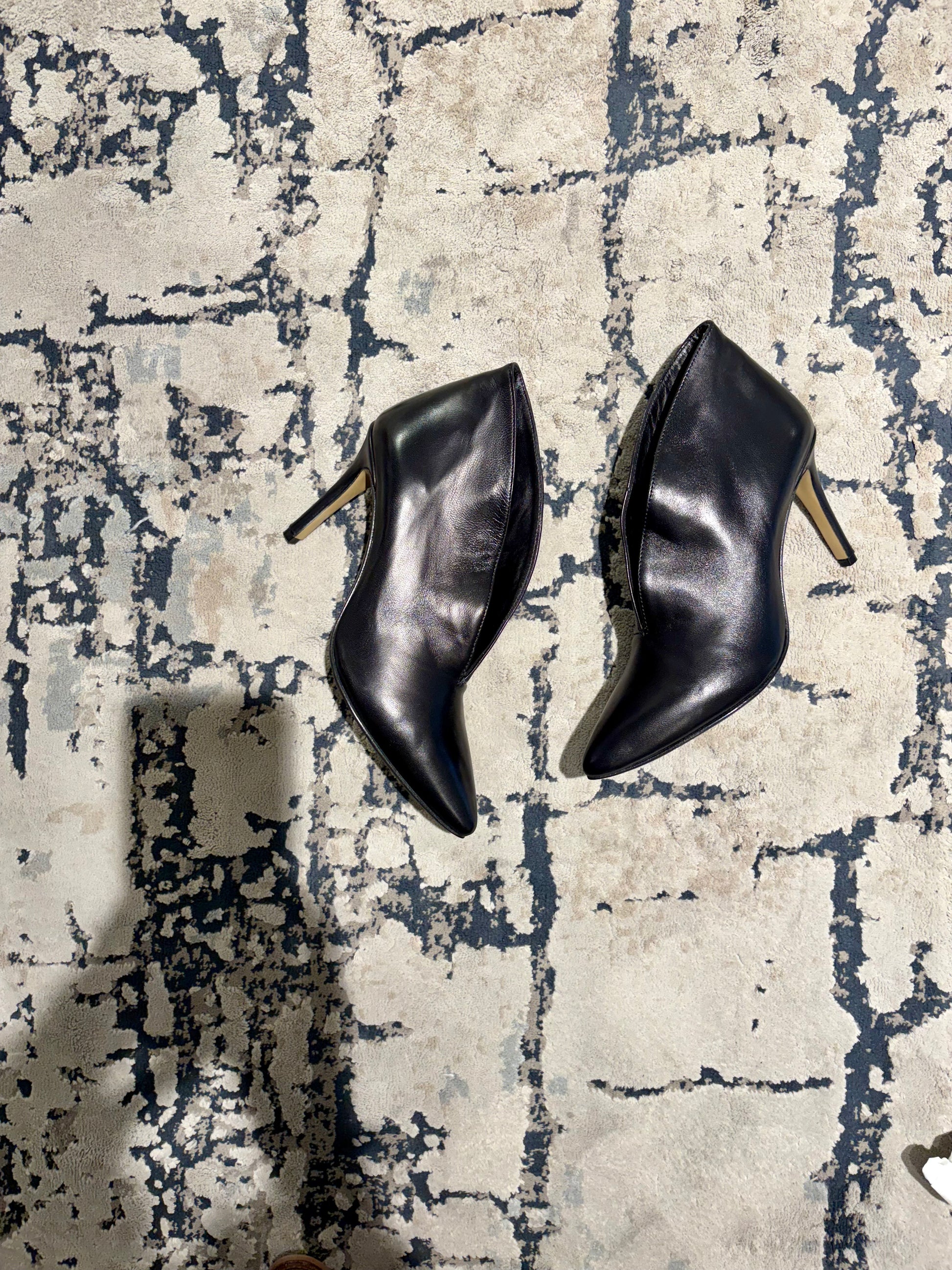 Questi stivaletti bootie nero uniscono linee pulite e un’eleganza senza tempo. Sono il perfetto equilibrio tra versatilità di uno stivaletto e la raffinatezza di un décolleté. Realizzati in morbida nappa liscia nera, offrono una calzata confortevole e un aspetto lussuoso. La pelle abbraccia la caviglia con una scollatura leggermente asimmetrica che aggiunge un tocco moderno. La punta affusolata e allungata dona un look sofisticato e slancia la figura.