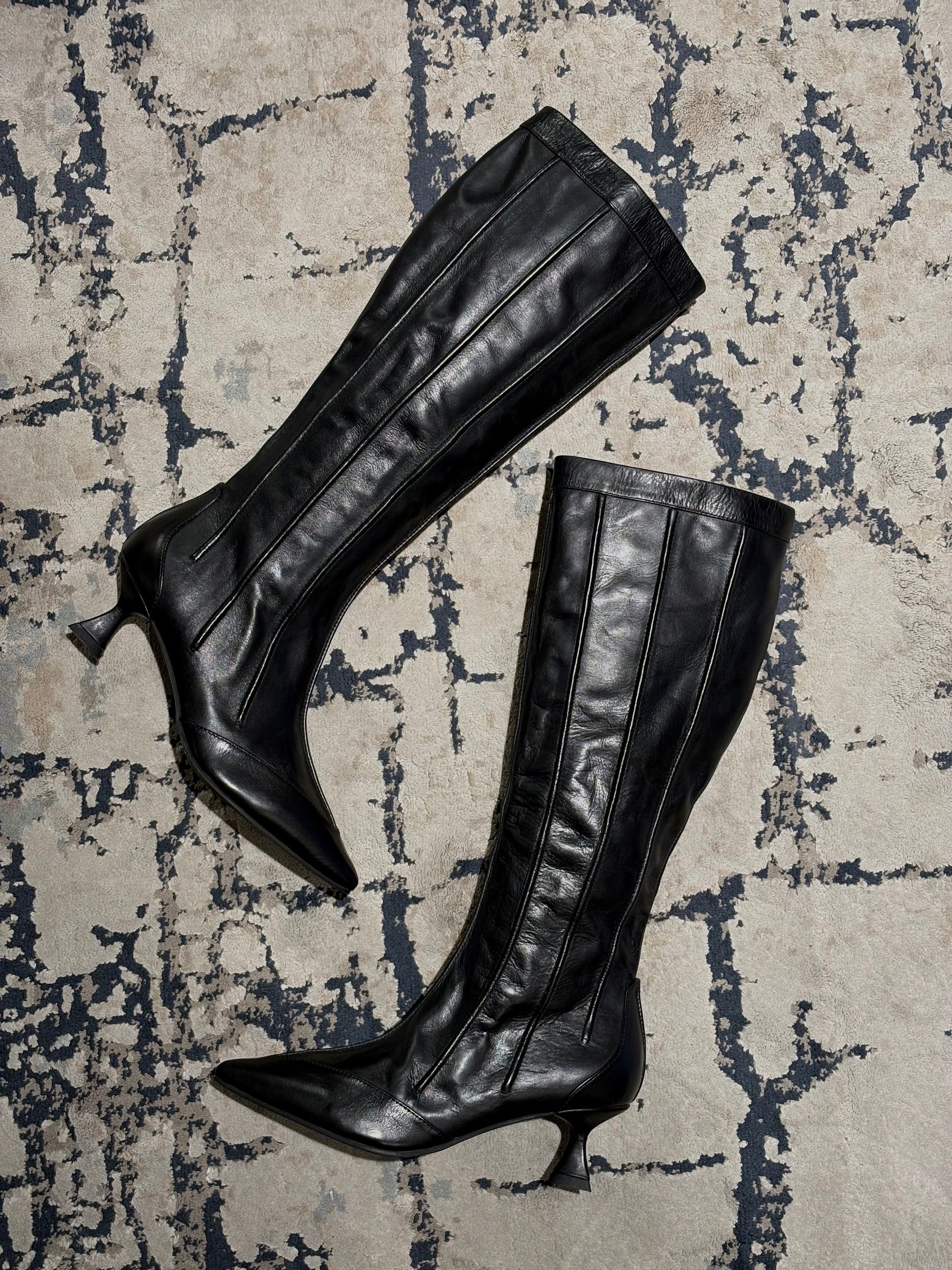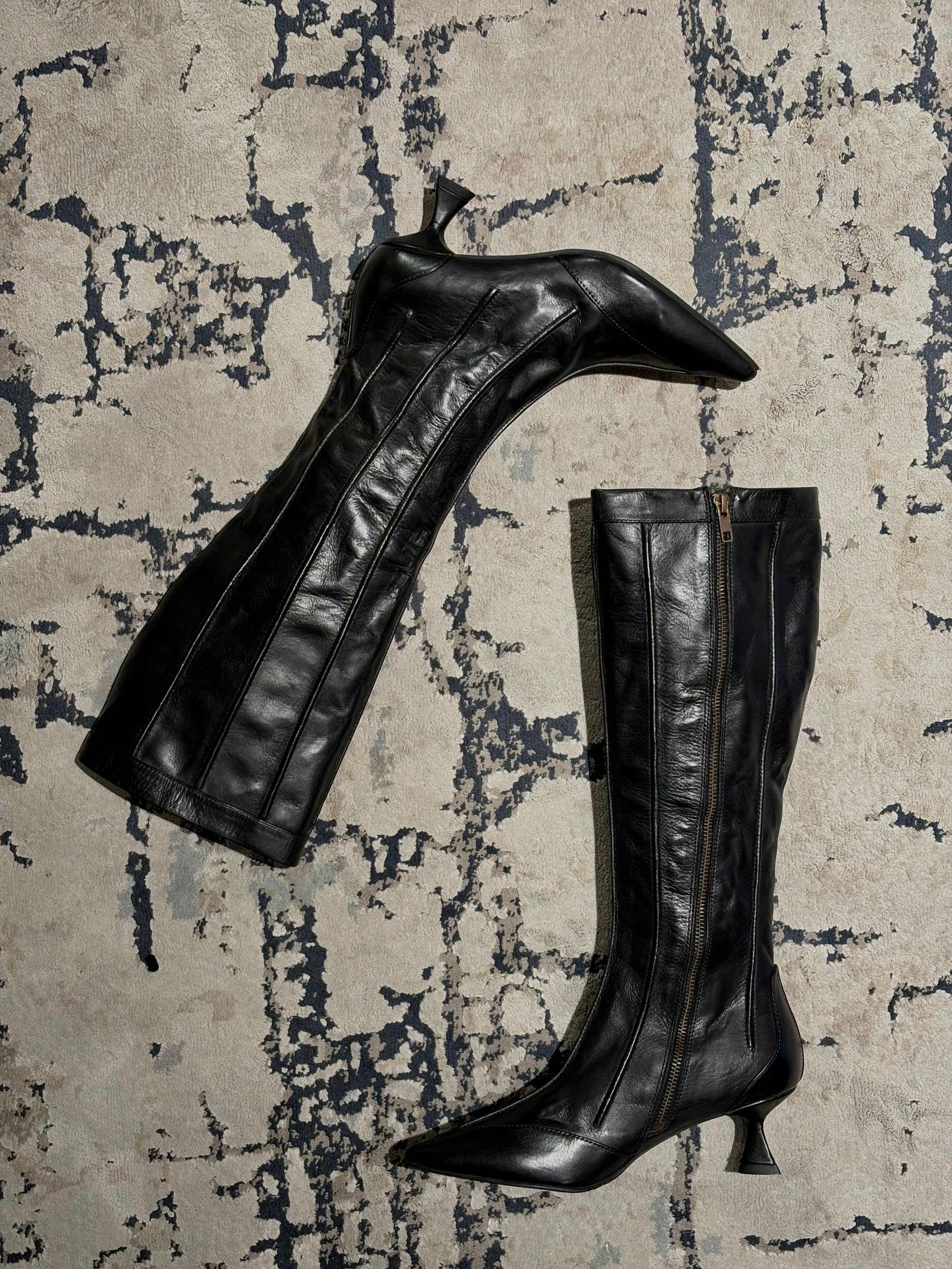 Stivale alto realizzato in morbida pelle nera. Modello al ginocchio, strutturato da nervature verticali che aggiungono un dettaglio sartoriale e permettono un fit impeccabile. Design a punta affusolata per una silhouette slanciata. Un audace tacco a rocchetto di media altezza, che garantisce stabilità e aggiunge un tocco di design unico. Linea aderente ed elegante.